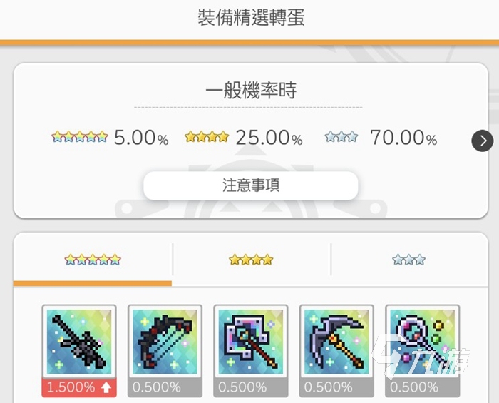 裝備扭蛋(一般概率時(shí)):五星概率為5%,四星概率為25%,三星概率為70%;