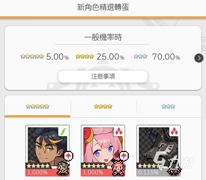 新角色扭蛋(一般概率時(shí)):五星概率為5%,四星概率為25%,三星概率為70%;