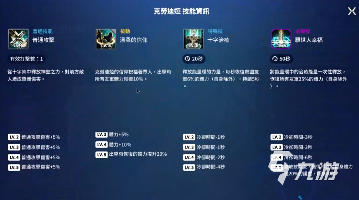 特殊技能:釋放恢復(fù)能力,每秒為周圍的友軍帶來百分比的體力值恢復(fù),效果持續(xù)的時(shí)間為五秒。這個(gè)恢復(fù)效果的范圍還是很大的, 恢復(fù)的百分比也不錯(cuò),持續(xù)五秒大概可以帶來將近一半的體力值恢復(fù)。不過克勞迪亞自身是無法獲得恢復(fù)的,這個(gè)也算是一個(gè)缺點(diǎn)吧。技能等級(jí)提升之后可以獲得冷卻的獎(jiǎng)勵(lì),戰(zhàn)斗中可以頻繁的使用。