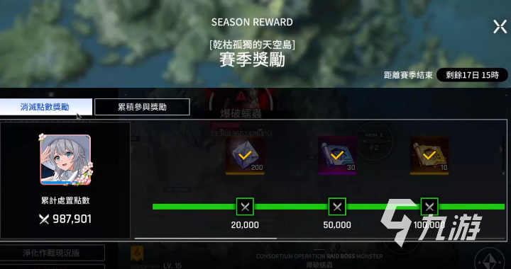 再來了解一下戰(zhàn)斗的獎(jiǎng)勵(lì),獎(jiǎng)勵(lì)是包含有參與獎(jiǎng)勵(lì)和點(diǎn)數(shù)獎(jiǎng)勵(lì)。參與獎(jiǎng)勵(lì)簡(jiǎn)單來說參與一定的次數(shù)之后就可以領(lǐng)取,對(duì)于戰(zhàn)斗的傷害是沒有要求的。而點(diǎn)數(shù)的話就要求輸出了,輸出達(dá)到對(duì)應(yīng)的點(diǎn)數(shù)才可以領(lǐng)取獎(jiǎng)勵(lì)的。
