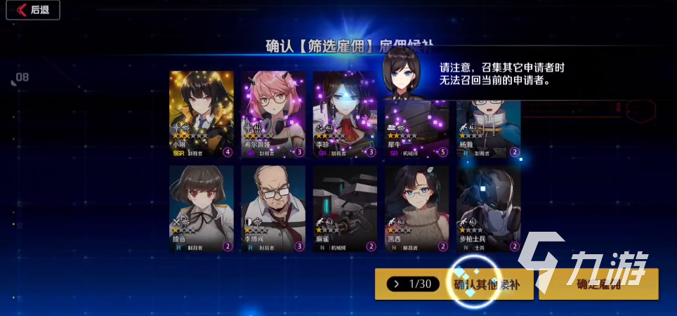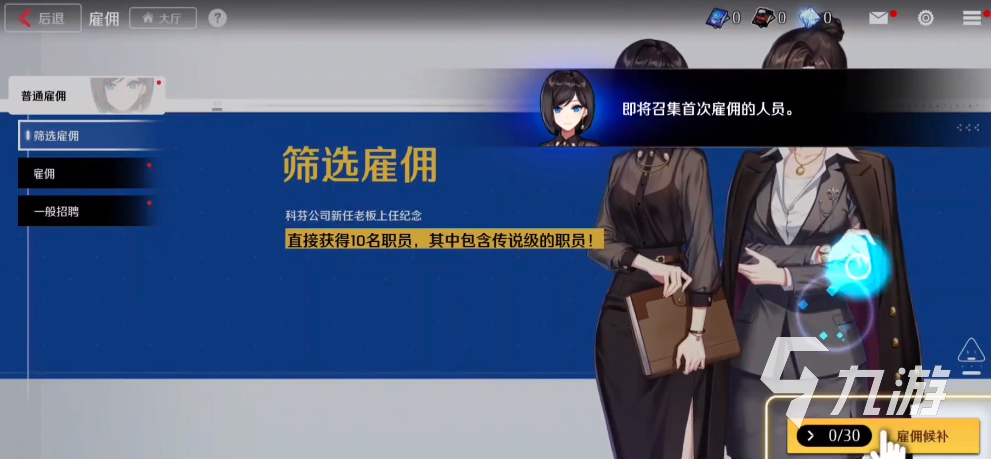 在進(jìn)入之后,先來介紹一下每個(gè)玩家的新手福利,這個(gè)福利可以讓玩家進(jìn)行一次篩選雇傭。這個(gè)是什么意思呢?也即是說每個(gè)新手玩家在體驗(yàn)的時(shí)候,可以獲得三十次的十連結(jié)果,然后在這三十次里面選擇一次的結(jié)果來進(jìn)行獲得。這個(gè)就相當(dāng)于提升了高級(jí)員工的獲取概率,小編建議大家優(yōu)先選擇稀有的SSR員工,不管是哪個(gè)定位的都是很強(qiáng)的。
