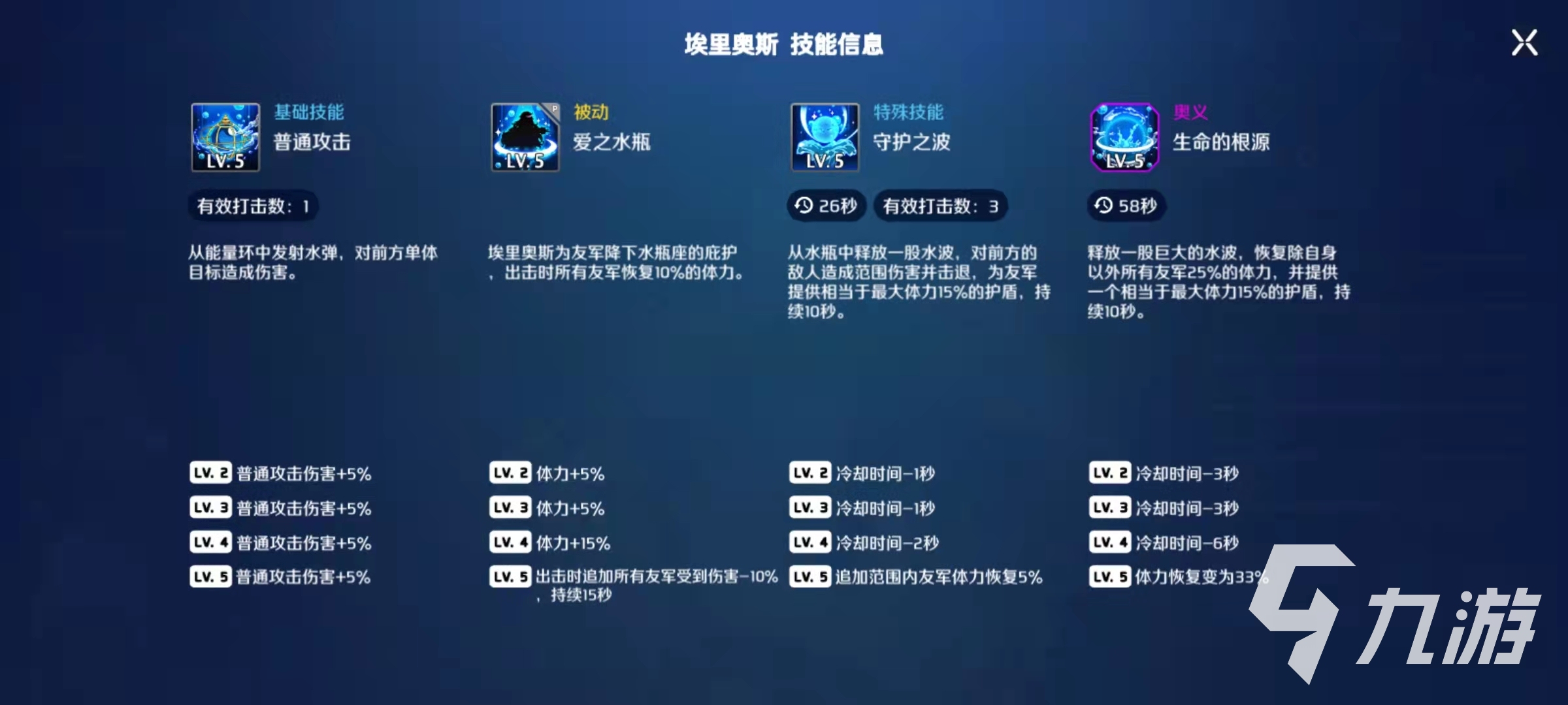 埃里奧斯是屬于十二宮騎士團(tuán)的角色,自身的被動(dòng)技能愛(ài)之水瓶,可以在出擊的時(shí)候,為所有的友軍恢復(fù)百分之十的體力,在達(dá)到滿星的時(shí)候,還可以額外的附加百分之十的傷害減免效果。這樣就將整個(gè)隊(duì)伍的續(xù)航能力提升了一個(gè)臺(tái)階,非常適合走穩(wěn)定路線的玩家使用。特殊技能守護(hù)之波,可以對(duì)前方的敵人造成范圍傷害并且擊退,并且為友軍施加于一個(gè)護(hù)盾,護(hù)盾的數(shù)值和埃里奧斯的最大體力值相關(guān)。