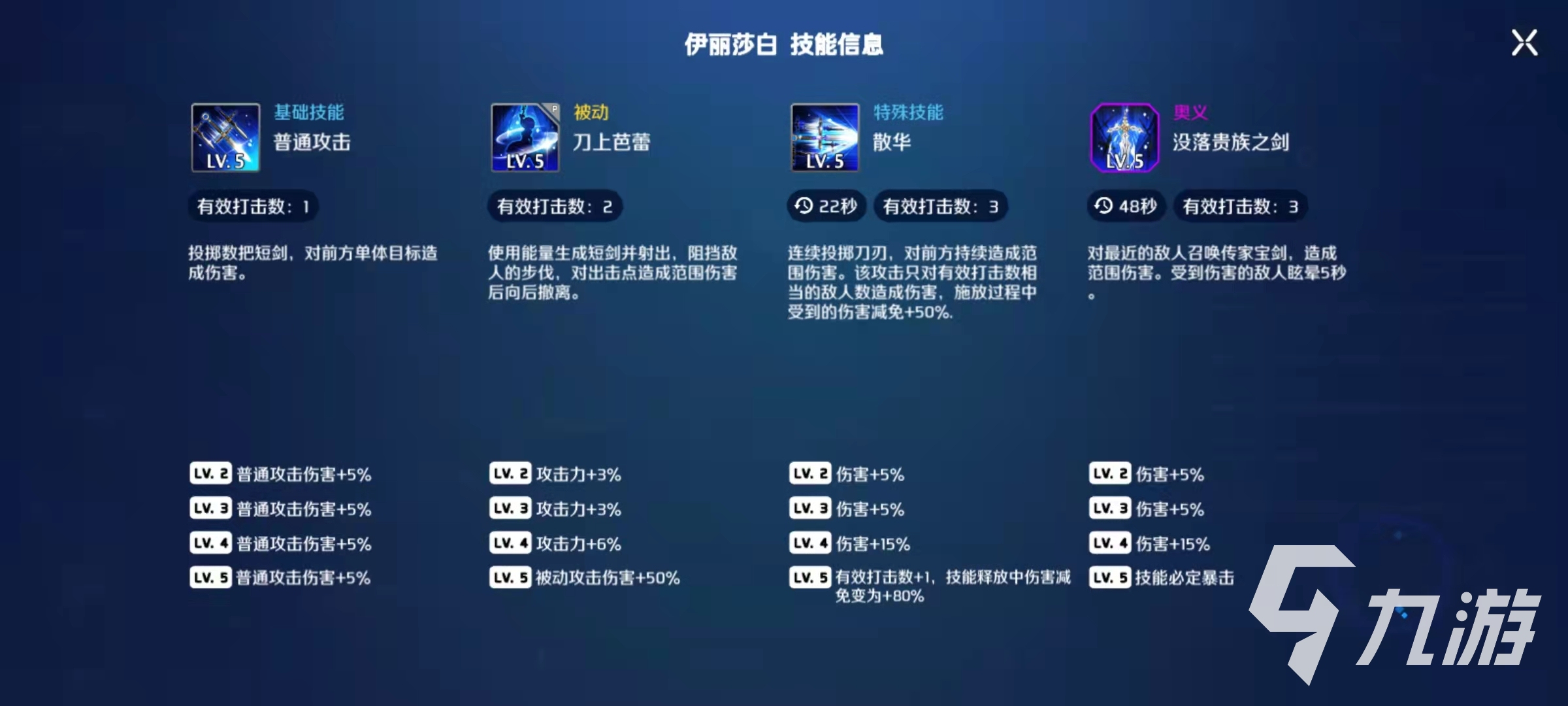 奧義技能沒落貴族之劍的效果是召喚寶劍進行范圍傷害,并且對傷害目標進行眩暈。這個技能的控制效果要大于傷害效果。綜合這些技能效果來看,伊麗莎白對于隊伍的整體貢獻是非常不錯的,尤其是最后的控制技能,還有被動的擊退效果。
