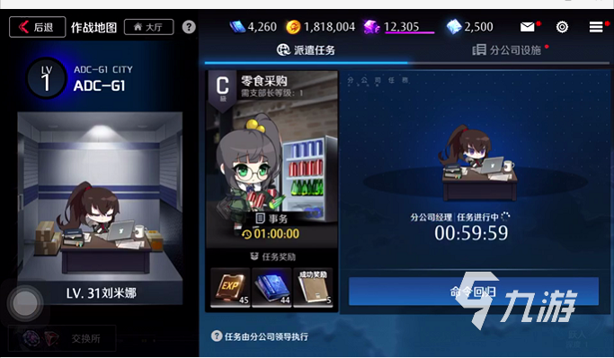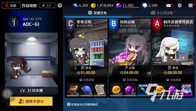 在各分子公司執(zhí)行多種派遣任務(wù),可以獲得多種獎勵,分公司的等級越高,則可以獲得的任務(wù)水平則越高,為了執(zhí)行派遣任務(wù),分公司的領(lǐng)導(dǎo)等級必須滿足期望等級,事務(wù)任務(wù)可以由分公司領(lǐng)導(dǎo)單獨處理,但其他任務(wù)必須派遣小隊,分公司領(lǐng)導(dǎo)等級越高,派遣任務(wù)成功的幾率則會越大,當(dāng)派遣任務(wù)大成功時可以獲得大成功道具獎勵。