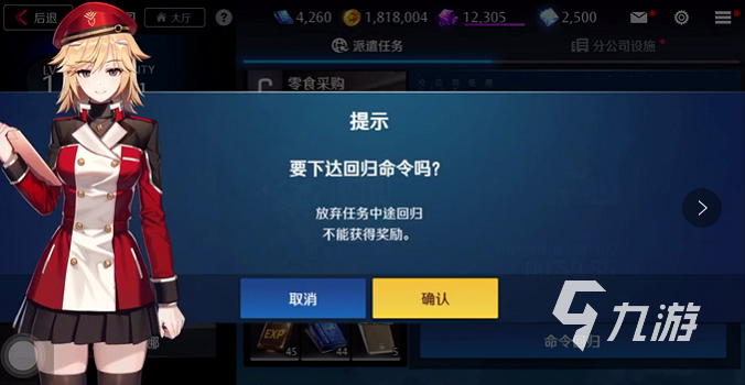 開啟后可以提升相應(yīng)的技能達到70% ,比如確認執(zhí)行派遣任務(wù)零食采購,此任務(wù)成功率為60%,通過派遣后可以看到需要相應(yīng)的一段時間才能順利完成采購任務(wù),在中途中可以對命令進行回歸,回歸命令可以放棄任務(wù),中途回歸,因為中途放棄,所以不能獲得相應(yīng)的道具獎勵。