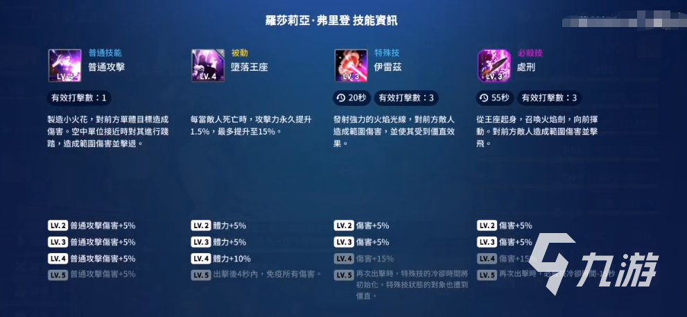 被動(dòng)技能:該技能是一個(gè)增益技能,在戰(zhàn)斗中有敵人陣亡的話,那么羅莎莉亞就會(huì)獲得攻擊力的提升,每個(gè)提升1.5%的攻擊力,最多疊加十次也就是15%的傷害能力。在等級(jí)滿級(jí)之后,在出場的四秒內(nèi)還可以免疫所有的傷害,還是非常不錯(cuò)的技能。