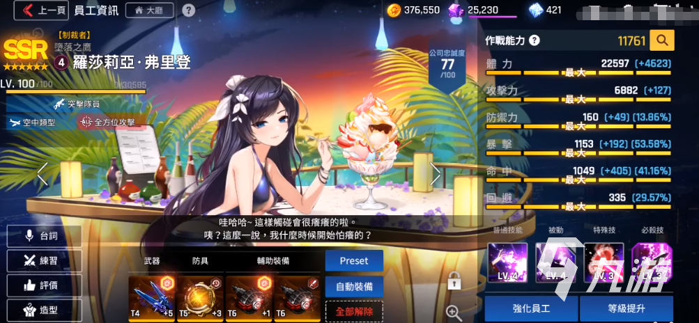 羅莎莉亞這個(gè)員工的品級(jí)是SSR級(jí)別在,在游戲中是最高的一個(gè)設(shè)定,但同時(shí)在獲取的難度上也是比較高的。該員工的定位是突擊,帶有攻擊空中單位的能力,攻擊屬性也是比較不錯(cuò)的。