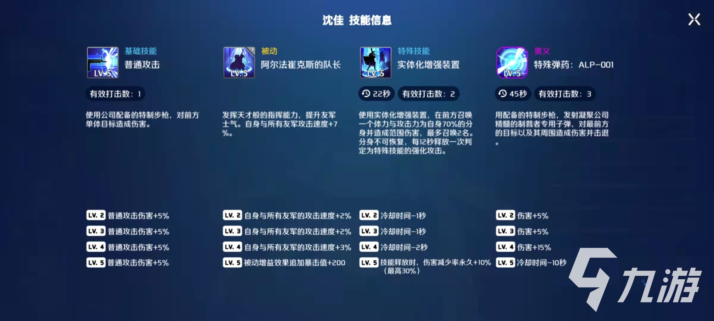 沈佳的被動技能效果是提升友軍的士氣,從而增加友軍的攻擊速度,在滿星的時候可以增加百分之七的速度,還有額外的二百點暴擊值。這些都是輸出非常需要的屬性,尤其是暴擊值,在突擊隊員和先鋒這里,暴擊對于傷害的提升都是非常可觀的。特殊技能是可以召喚出一個具有自身百分之七十實力的分身,分身可以造成范圍傷害,最多可以同時存在兩名分身,之所以說沈佳是傷害最高的突擊隊員之一,和這個分身技能是分不開的。