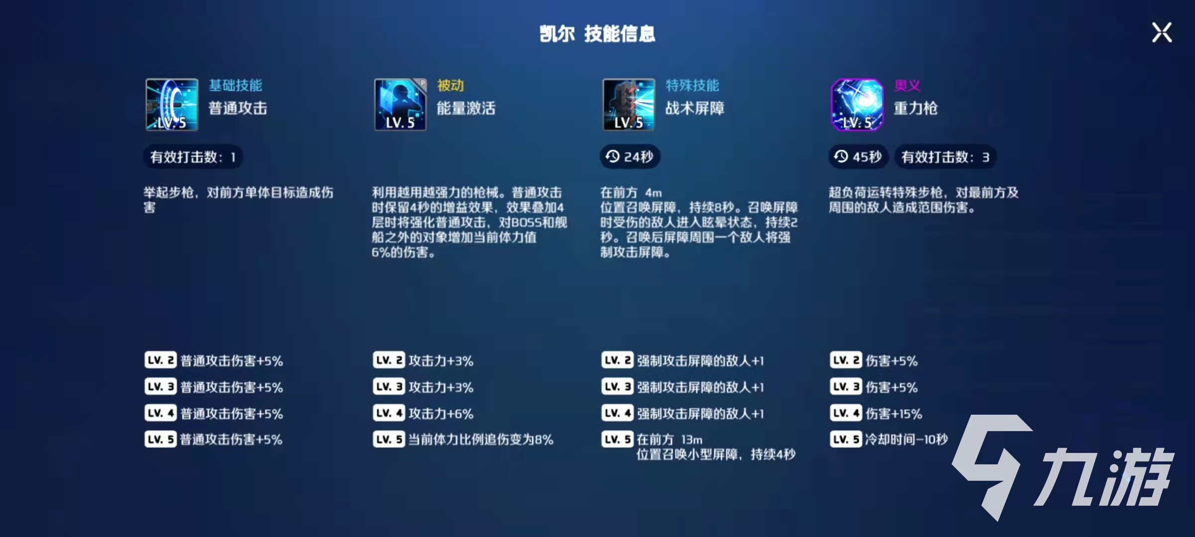 特殊技能戰(zhàn)術(shù)屏障,這個技能可以召喚出一個屏障,持續(xù)八秒鐘,當有敵人走進屏障的時候就可以眩暈對方,而且屏障出來之后會強制對方攻擊屏障,這樣就起到了吸引對方火力的作用。奧義技能重力槍的效果是可以傷害前方的敵人,凱爾最大的特點就是傷害和控制兼?zhèn)?,這樣在前排被突破了之后,自己還可以使用技能延遲對方的進攻,保護自己的安全。
