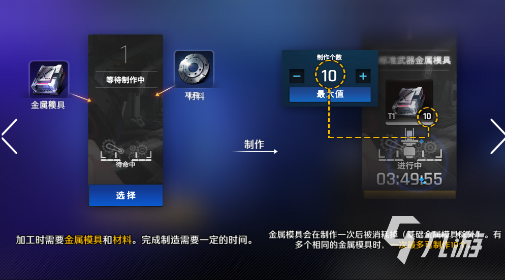 再來就是制造裝備的材料,材料的話消耗武器金屬模具,這個模具會隨著選擇的品級來進(jìn)行消耗上的提升。獲取方式的話可以通過一些挑戰(zhàn)關(guān)卡和躍入的獎勵來得到。如果說有對應(yīng)材料的話,也是可以選擇在公司制作中來進(jìn)行操作的。這個制作的話花費(fèi)的時間是比較長的,所以說要盡量的提前準(zhǔn)備好一些才行。