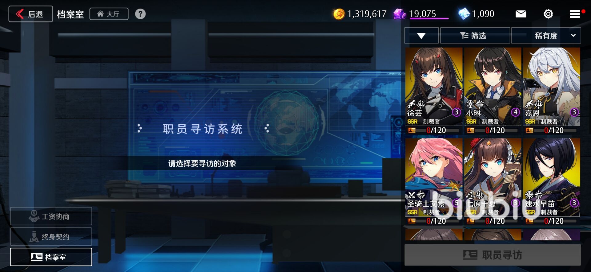 檔案室主要玩法:在這里面,玩家們可以將所收集的角色檔案進(jìn)行合成,sr級別的職員需要80個檔案,ssr一般都是需要120個,也就是說角色的檔案不會放在背包里面,而是存放在了老板辦公室中的檔案室,集齊一定數(shù)量之后,就可以點(diǎn)擊右下角的職員尋訪,說白了就是碎片合成想要的角色。