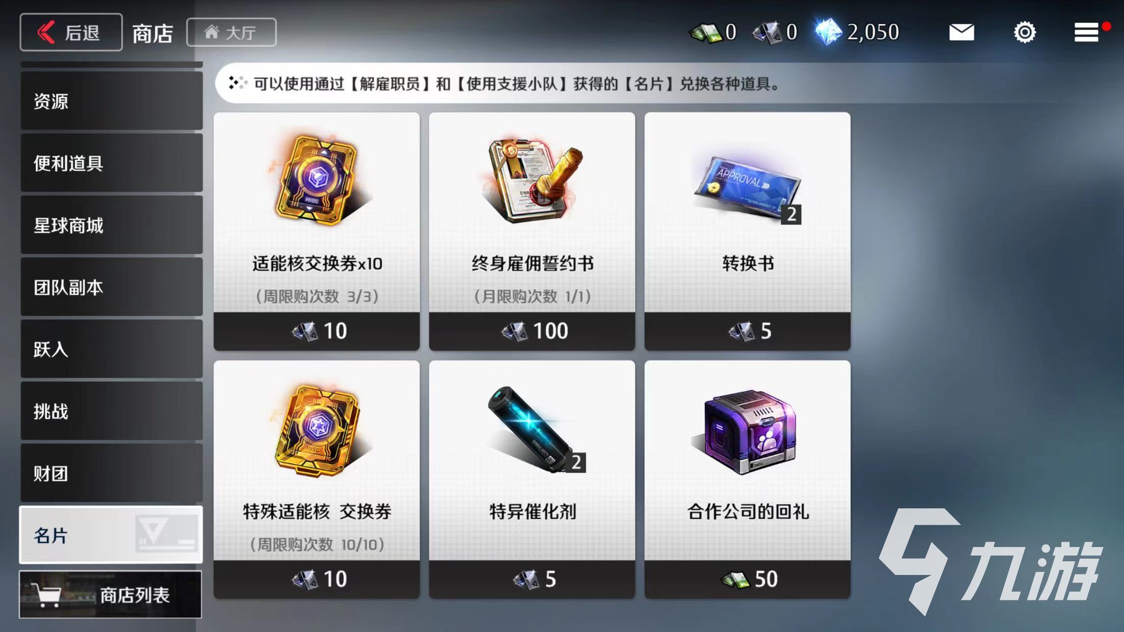在名片商店中,玩家可以通過(guò)消耗鉆石或其他道具兌換多種需要的商品,其中包括名片,通過(guò)消耗無(wú)主名片道具可以兌換多種道具,比如通過(guò)消耗10個(gè)無(wú)主名片可以兌換10張制裁者適能核道具,每周僅限兌換10次。