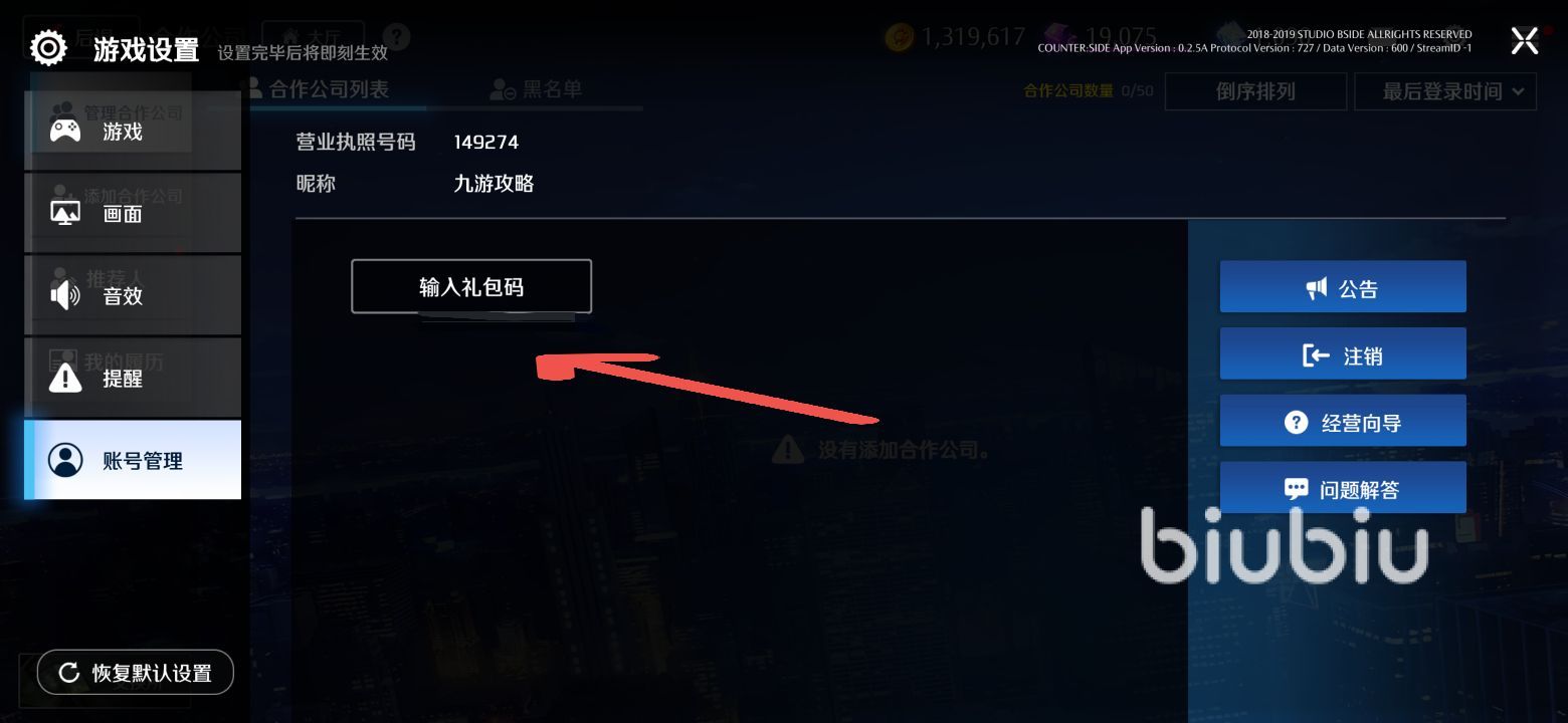 兌換的地址大家需要來到游戲的主界面,看到右上角的齒輪標(biāo)識(shí),點(diǎn)進(jìn)去之后,點(diǎn)擊左下角的賬號(hào)管理,就可以看到兌換碼,輸入進(jìn)去點(diǎn)擊確定領(lǐng)取就可以,在這里仍然強(qiáng)烈推薦大家使用biubiu加速器加速一下異界事務(wù)所手游,這款手游最近開服承載的玩家數(shù)量確實(shí)比較多,有許多玩家反映閃退以及網(wǎng)絡(luò)卡頓等問題,使用biubiu加速器就可以完美解決。