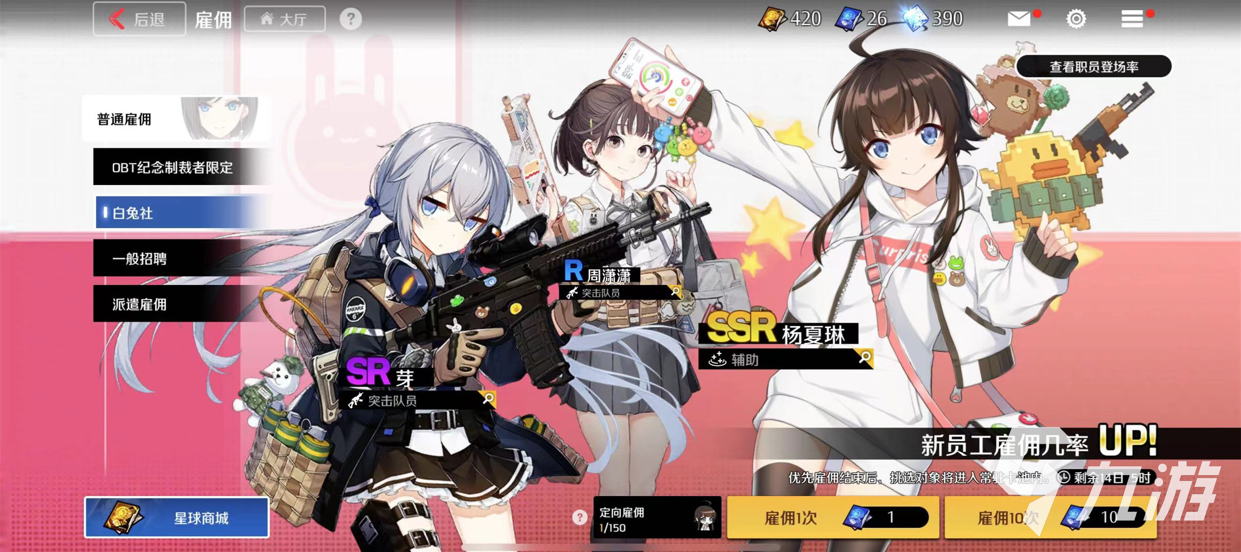 楊夏琳的獲取途徑目前只有一種方式,請(qǐng)玩家前往雇傭板塊來(lái)進(jìn)行獲取,進(jìn)入板塊以后會(huì)有很多種不同的列表,有OBT紀(jì)念制裁者限定的,有白兔社,一般招聘以及派遣雇傭,新手玩家可點(diǎn)擊白兔社。