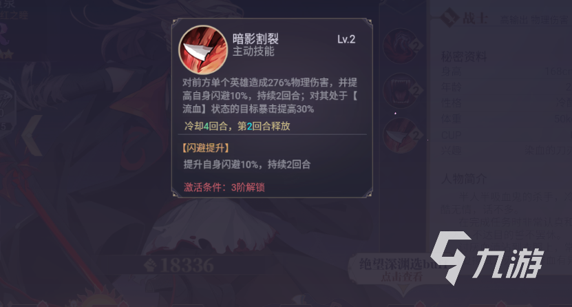 注定技能“暗影割裂”,這個(gè)是大招技能,使用之后對(duì)前方的單個(gè)英雄造成276%的傷害量,同時(shí)提升自身10%的閃避率。如果說(shuō)敵人剛好處于流血的狀態(tài)中,那么該技能的暴擊率會(huì)提升30%。