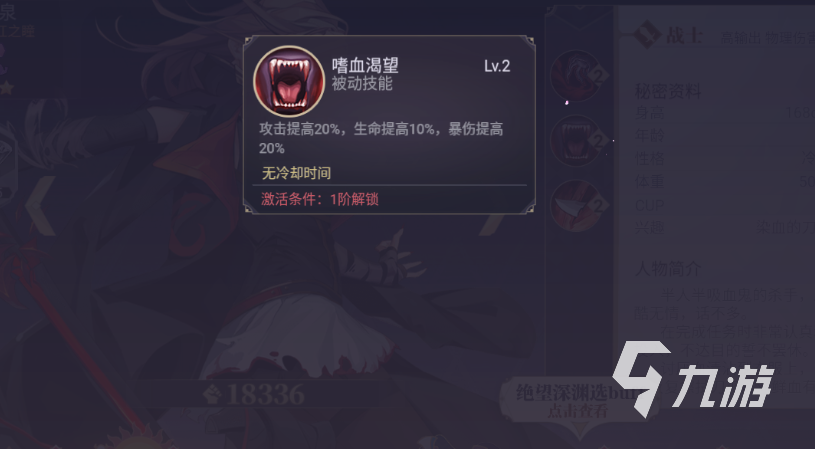 被動(dòng)技能“嗜血渴望”,作為血族的一個(gè)英雄,對(duì)于鮮血的渴望是很正常的。這個(gè)被動(dòng)可以帶來(lái)20%的攻擊力,10%的生命值以及20%的暴擊傷害提升效果。攻擊和生命效果都比較不錯(cuò),而暴擊傷害的話還是要有一定的暴擊基礎(chǔ)才可以頻繁觸發(fā),中期還是很不錯(cuò)的。