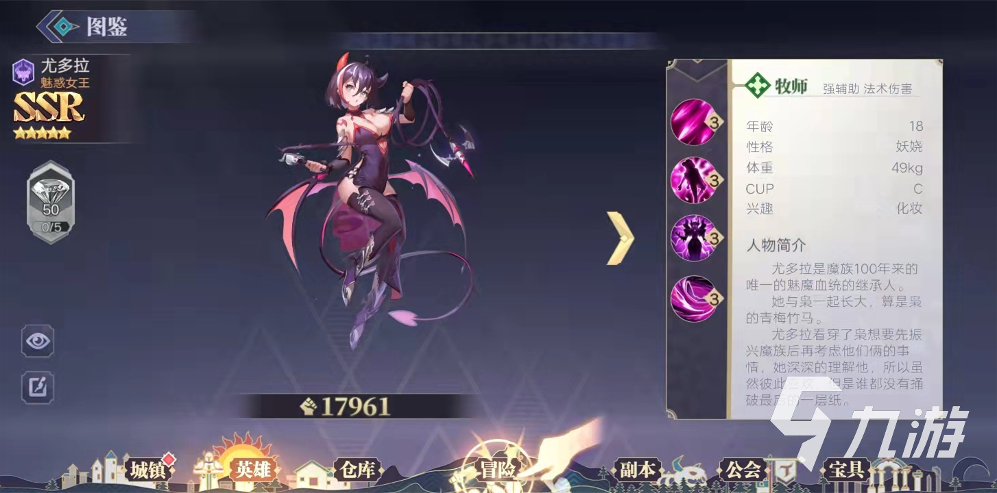 尤多拉作為牧師,是隊伍的核心,他是魔族唯一一個擁有魅魔血統(tǒng)的繼承人,擁有超強的魅惑能力,尤多拉的生命屬性非常高,可以很好的保護隊友,主動技能既可以幫助隊伍消耗敵人,也可以為友方成員附加保護盾,可以凈化所有負面效果,讓隊伍始終保持良好的輸出狀態(tài)。