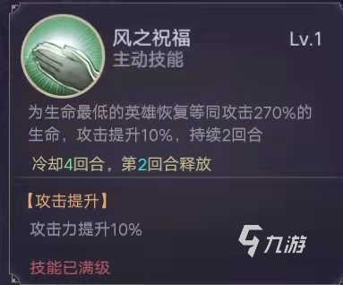 三技能風之祝福屬于他的主動技能,在釋放之后可為友方生命值最低的英雄恢復等同自身攻擊270%的生命,并且使其攻擊提升10%,持續(xù)時間為兩回合,該技能需要英雄品階達到三階的時候才能解鎖。