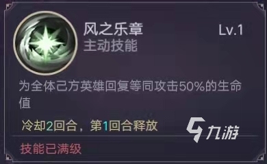 一技能風之樂章屬于一個主動技能,釋放之后可為友方全體英雄恢復等同自身攻擊50%的生命。