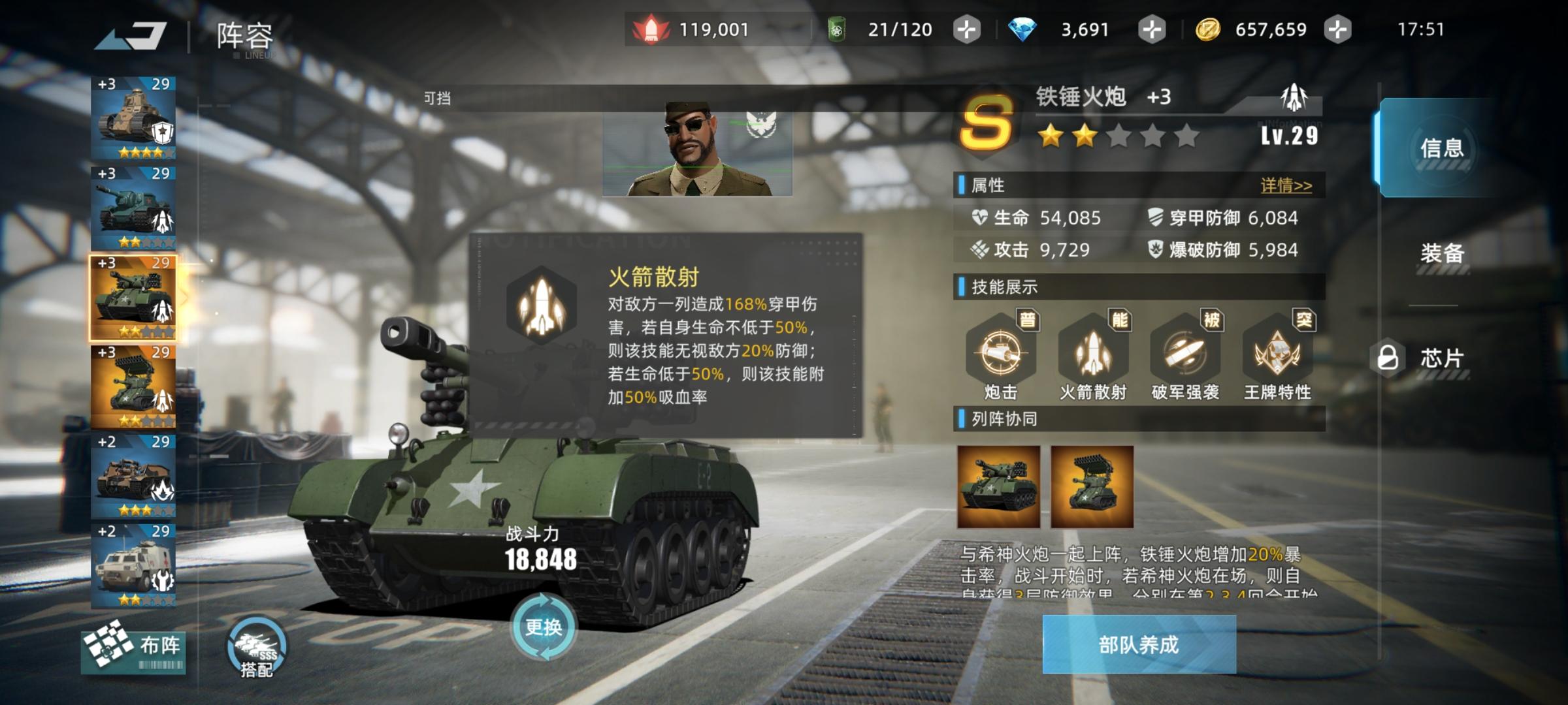 今天給大家介紹排名最靠前的六個(gè)坦克,第一位是鐵錘火炮,在游戲中屬于半輸出型半坦克型的定位,不像其他坦克,雖然輸出能力高,但是身板兒十分脆,他的火箭散射,可以對(duì)敵方一列造成穿甲傷害,無視敵方防御,還會(huì)回復(fù)自己的血量,進(jìn)階到五星之后,號(hào)令沖鋒這個(gè)技能如果單次承受,傷害不超過25%,則直接免疫此次傷害,這兩個(gè)技能的加持下,使鐵錘火炮成為強(qiáng)輸出以及吸血坦克,但是要培養(yǎng)到五星,可是要氪不少金的。