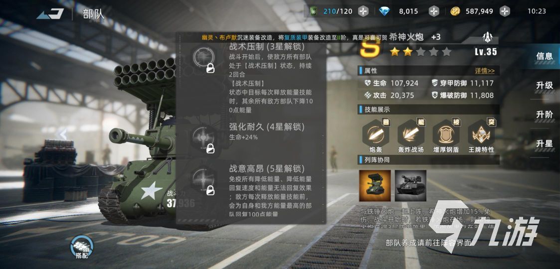 排名第六的就是野狼了,致命一擊主要為發(fā)射一枚強(qiáng)力炮彈,對(duì)敵方生命百分比最低的部隊(duì)造成240%的穿甲傷害,并且還會(huì)附帶敵方已損生命值最高的傷害,到三星之后,每次釋放能量技能的時(shí)候,則會(huì)擊退目標(biāo)一段距離,這是這六個(gè)坦克中唯一一個(gè)附帶斬殺效果的,但是由于技能是單體范圍,在團(tuán)戰(zhàn)中效果并不是很好,強(qiáng)化到三星之后才會(huì)有濺射傷害,還是推薦大家培養(yǎng)的。