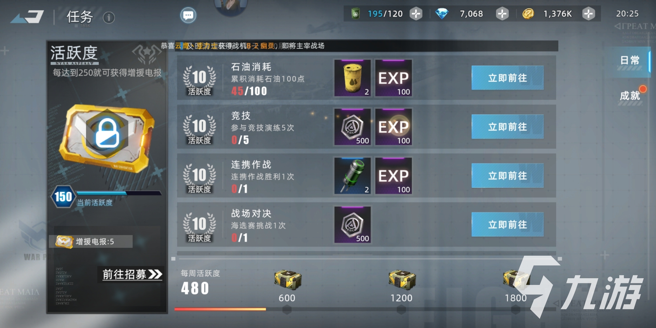 通過完成探索行動、石油消耗、好友切磋等每日任務也可獲得共計10點探索石油,探索石油和普通石油不同,只能在探索模式使用,可以獲得戰(zhàn)機培養(yǎng)素材、裝備專精材料等獎勵。
