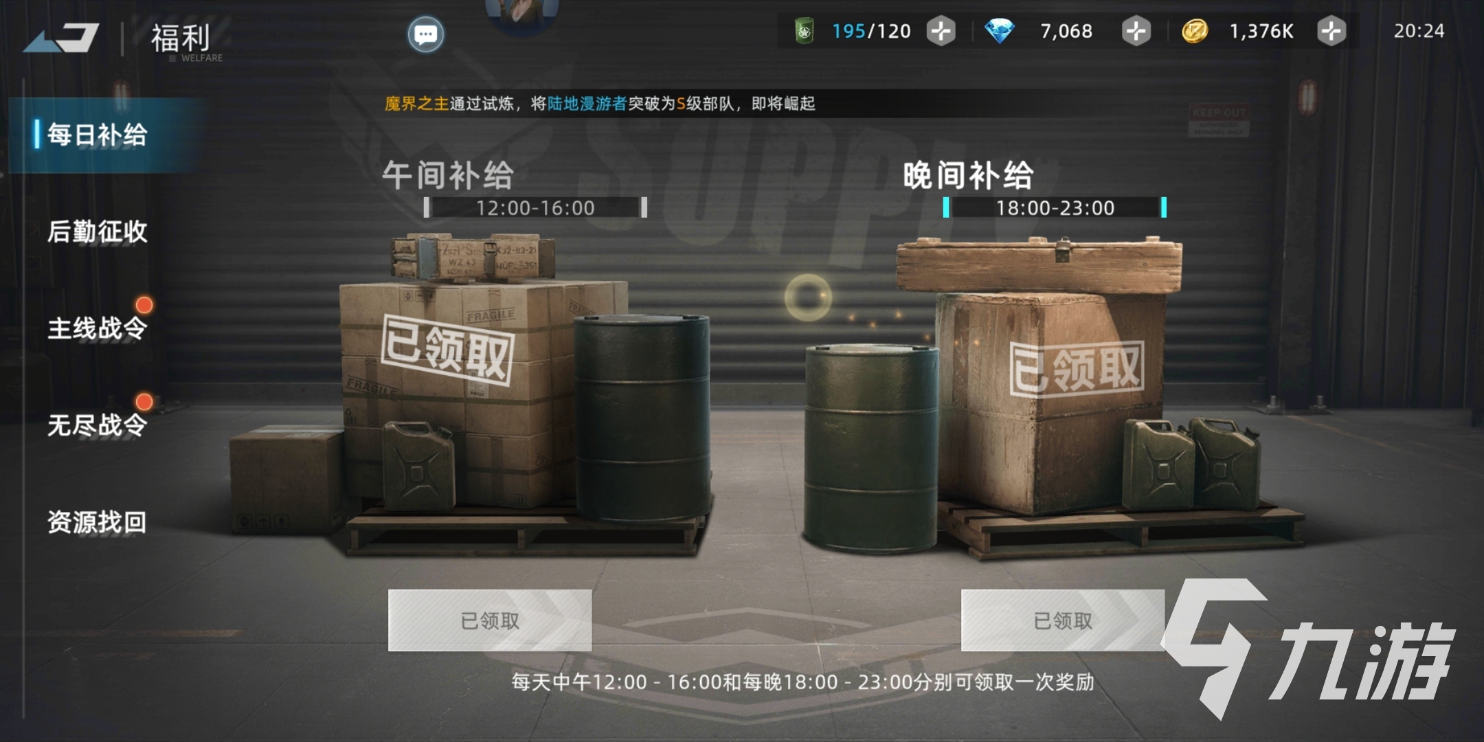 每日補給其實是一項免費獎勵能源補給箱的活動,其中午間補給時間段在12:00-16:00,晚間補給時間段在18:00-23:00,只需在這兩個時間段登錄游戲就可分別領取五個能源補給箱,共計500點石油。