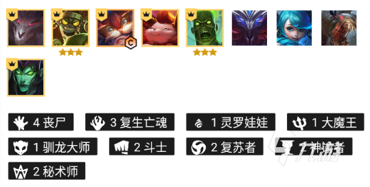 陣容羈絆:四喪失三復生亡魂兩斗士兩復蘇兩神諭兩秘術一靈羅娃娃一大魔王一馴龍大師。