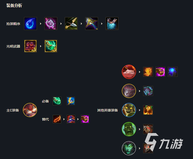 大頭必備青龍刀大天使,第三件最好是羊刀,沒(méi)有的話就給任意法強(qiáng)裝。喪尸攻擊屬性削弱后適合以肉裝為主,泰坦加雙抗和輸出,日炎前期打工好用,第三件補(bǔ)充反甲或者狂徒。剩下的AP裝或者功能裝可以給提莫。