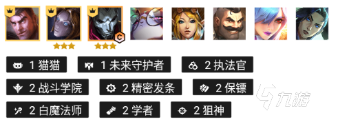 陣容羈絆:兩保鏢兩狙神一貓貓一未來守護者兩執(zhí)法官兩學院兩精密發(fā)條兩白魔法師兩學者。