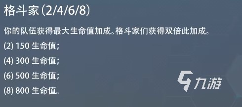 格斗者:己方組合里所有棋子的血量都會得到提升,而格斗者的棋子會得到雙倍提升,兩個該羈絆棋子,可以增加一百五十點血量,四個該羈絆棋子,可以增加三百點血量,六個該羈絆棋子,可以增加五百點血量,八個該羈絆棋子,可以增加八百點血量。