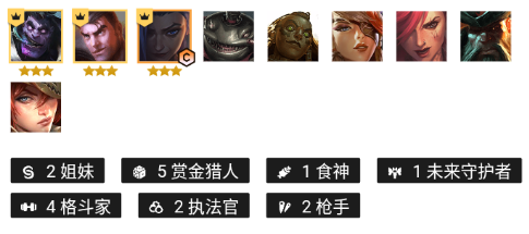 陣容羈絆:兩姐妹五賞金獵人一食神一未來守護者四格斗家兩執(zhí)法官兩槍手。