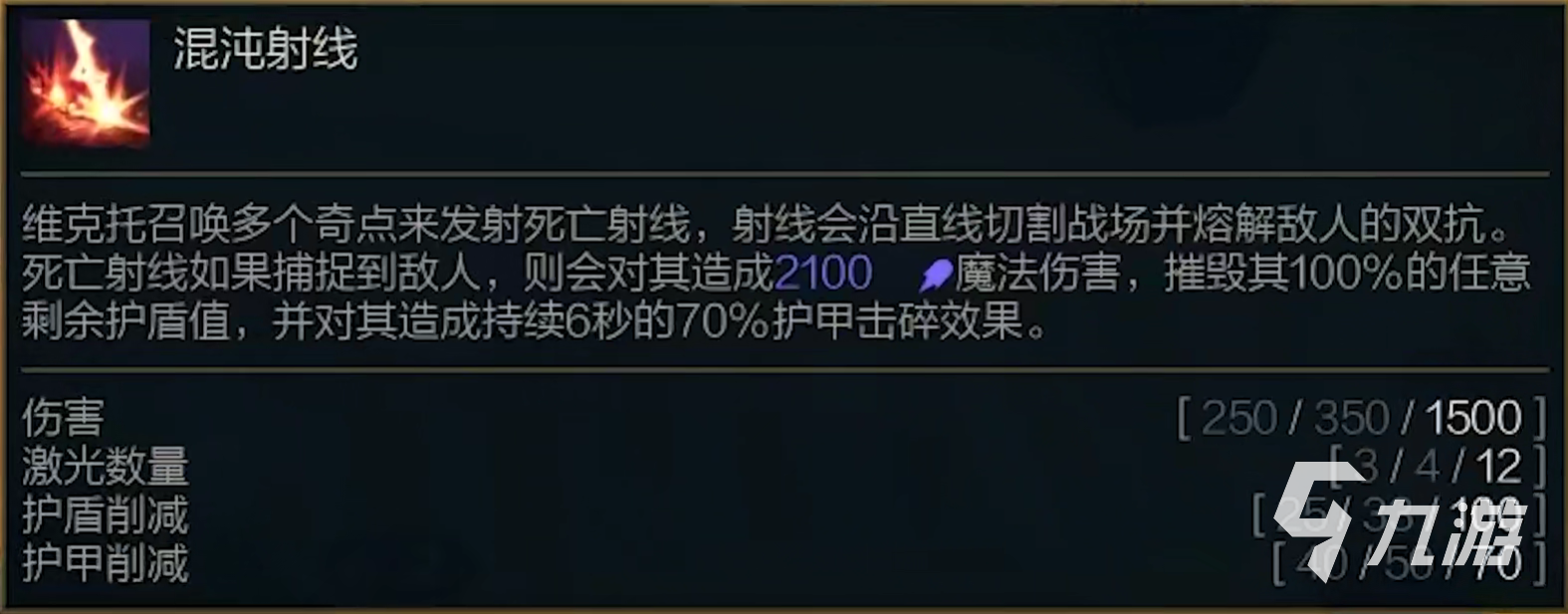 維克托的技能叫做混沌射線,它的效果是維克托能夠召喚多個奇點(diǎn)來釋放射線,射線會對敵人造成魔法傷害以及削弱護(hù)甲的效果。