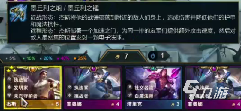 杰斯的技能還是很有趣的,杰斯共有兩個形態(tài),一個是近戰(zhàn)的形態(tài)、還有一個遠程的形態(tài),這兩個形態(tài)的切換要取決于他在戰(zhàn)斗準備階段的位置,位置靠后就是遠程,第一排就是近戰(zhàn)形態(tài),并且杰斯兩個形態(tài)的技能也有所不同。