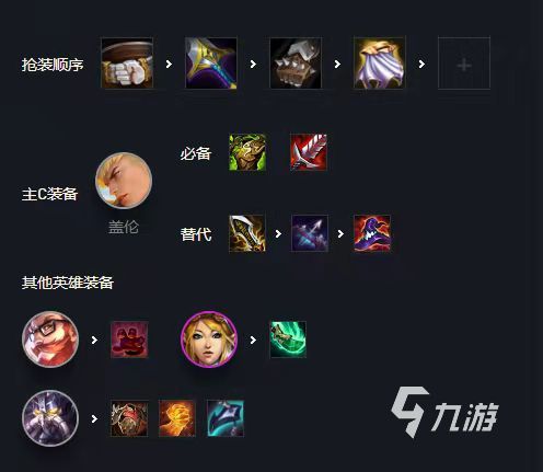 蓋倫先出肉裝,狂徒和飲血是核心裝備,最后一件輸出裝物理和法強(qiáng)裝備皆可、卡薩丁出肉,男槍撿漏。