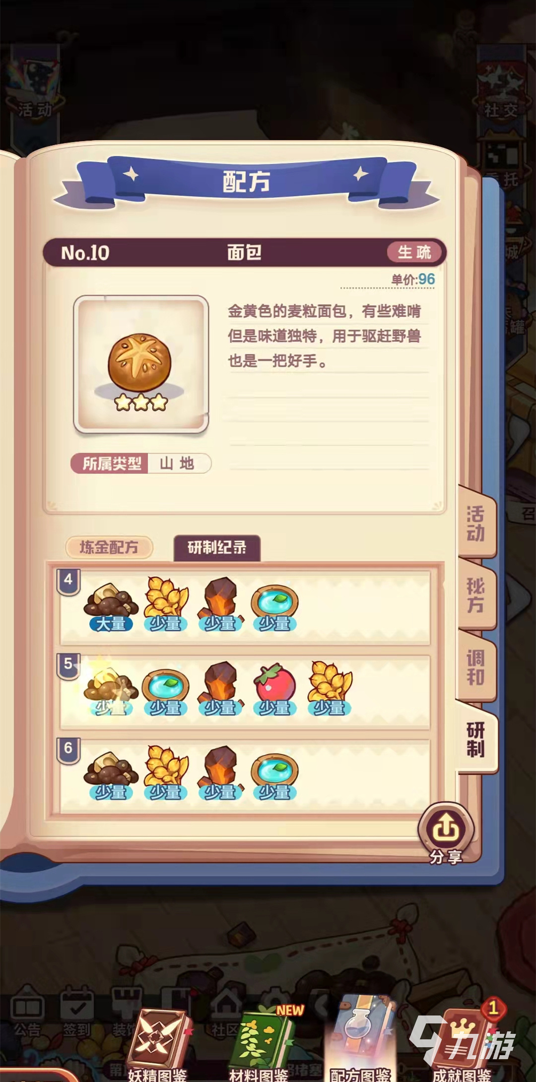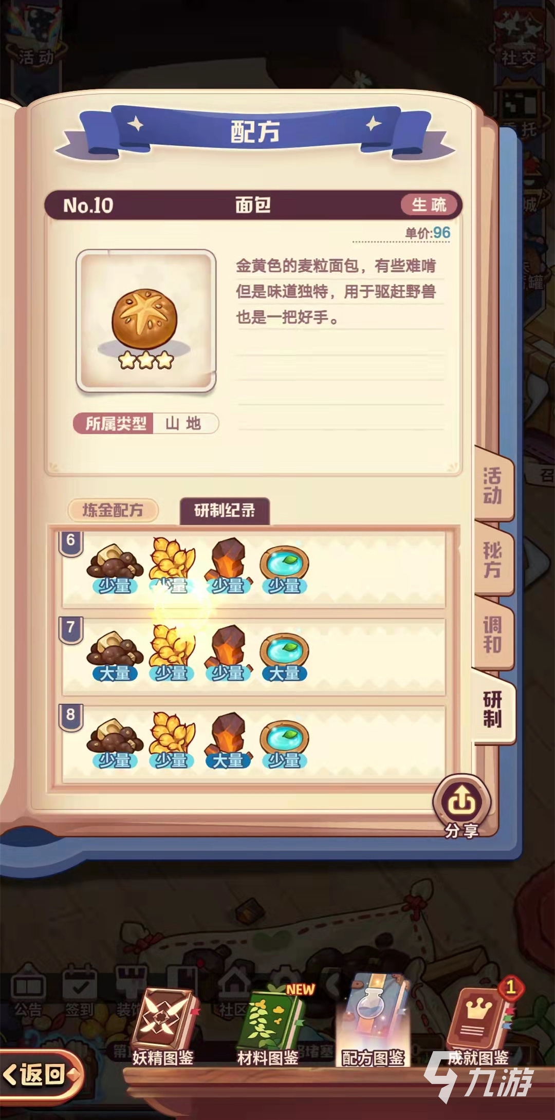 小編先介紹一下面包的類型屬于山地類型,是金黃色的麥粒面包,有些難啃,但是味道還是很獨特的,可以用于驅(qū)趕一些野獸,是防御的一把好手呢,其實面包的主要煉金配方是甜味黏土,魔法冰泉,黃金小麥和火結(jié)晶,小編通過各種嘗試研制出了八種面包配方。