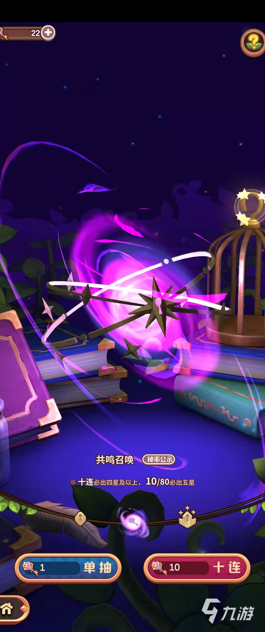 在中間的部分有一個(gè)向右的符號(hào),點(diǎn)擊符號(hào)就可以看到第二種召喚方法共鳴召喚,共鳴召喚消費(fèi)的道具是金色鑰匙,和基礎(chǔ)召喚相似都有單抽和十連,但是共鳴召喚十連必出四星及以上的妖精,共鳴召喚達(dá)到八十次必出五星妖精,共鳴召喚掉妖精的概率在百分之二十五點(diǎn)五,五星百分之二,四星的百分之五點(diǎn)五,三星的百分之八,二星的百分之十,禮物的概率在百分之四十,其他的在百分之三十四點(diǎn)五。