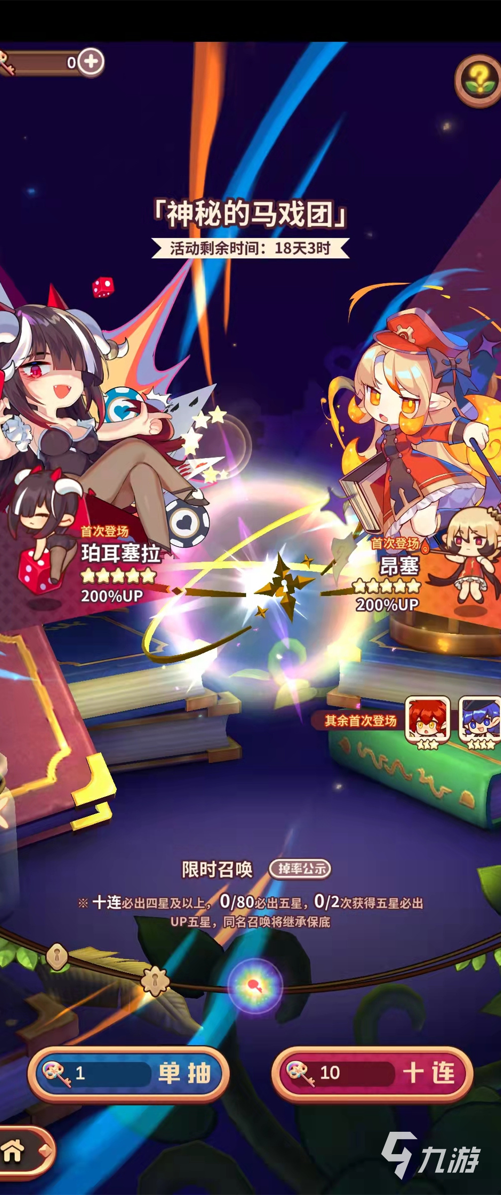 在向右就是第三種方法限時(shí)召喚,用到的道具是彩虹鑰匙,也是單抽和十連,十連必出四星及以上,召喚達(dá)到八十次必出五星,兩次獲得五星必出CU五星,同名召喚將繼承保底,掉的概率和共鳴召喚的概率是一樣的。