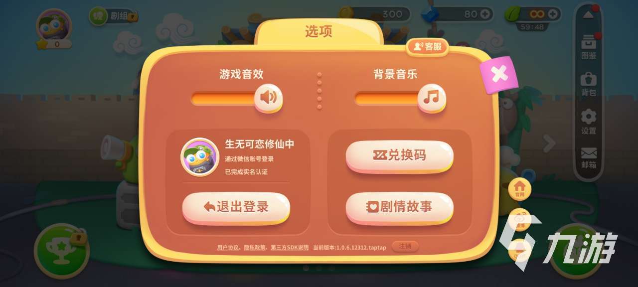 點(diǎn)擊這個圖標(biāo)會出現(xiàn)四樣?xùn)|西,分別是圖鑒、背包、設(shè)置、郵箱,選擇第三個設(shè)置并點(diǎn)擊,此時將彈出一個選項方框,在這個方框中有游戲音效、背景音樂、退出登錄、兌換碼、劇情故事,大家先在應(yīng)該都知道點(diǎn)擊誰了吧?