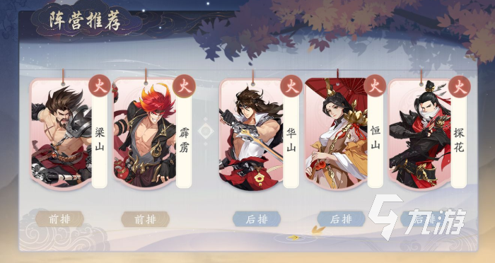 一個(gè)陣容當(dāng)中前排是最重要的,所以小編選擇比較熱門的霹靂和梁山組合,這兩個(gè)武俠組合不僅輸出高并且還特別能抗,再加上后排的恒山、華山、探花三個(gè)武俠,這樣的一套純火系陣容刷本的效率絕對特別高。恒山可以提供全隊(duì)的免傷增益BUFF,讓兩個(gè)前排能夠輸出更長時(shí)間,畢竟一套陣容一定前排夠硬才可以打出更高的輸出,如果沒有恒山的話也可以用其他的增益性武俠來補(bǔ)充。