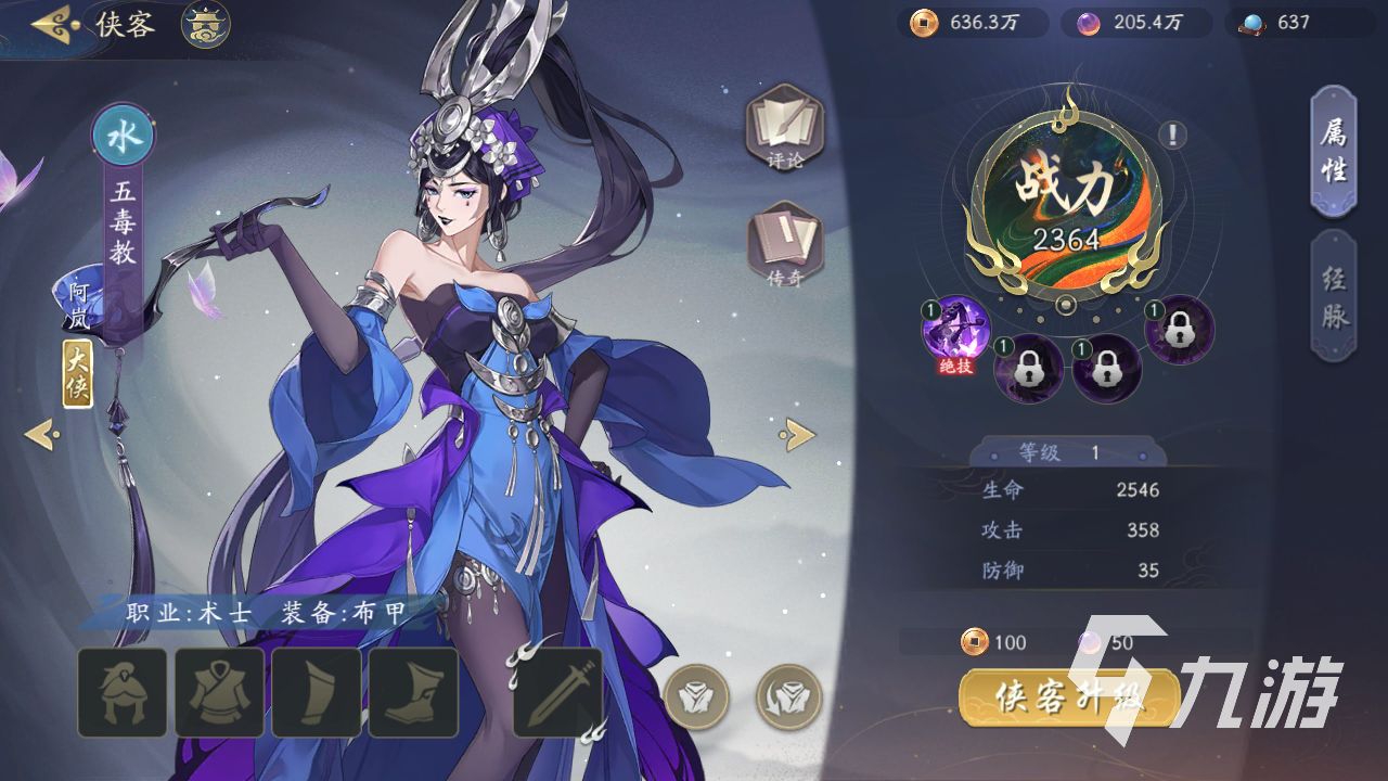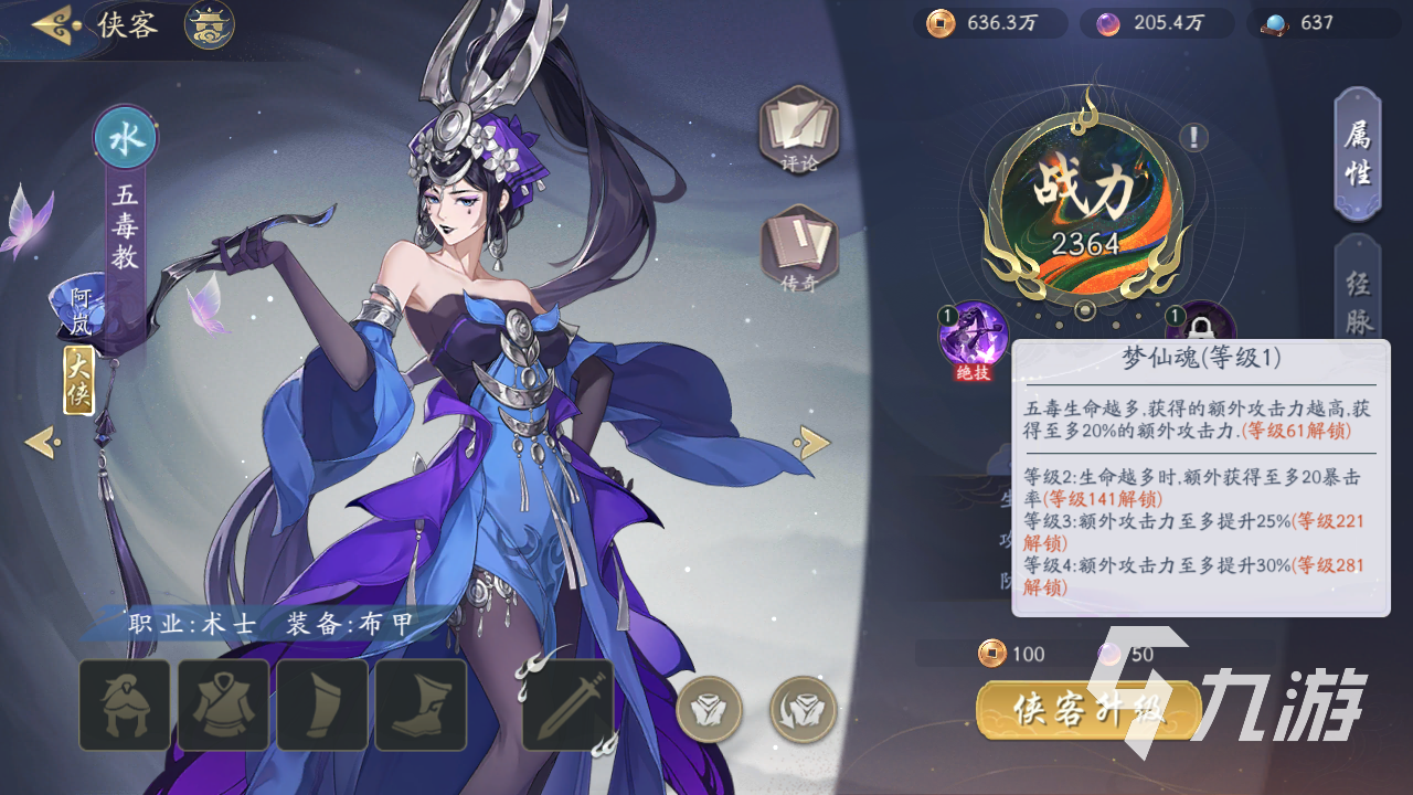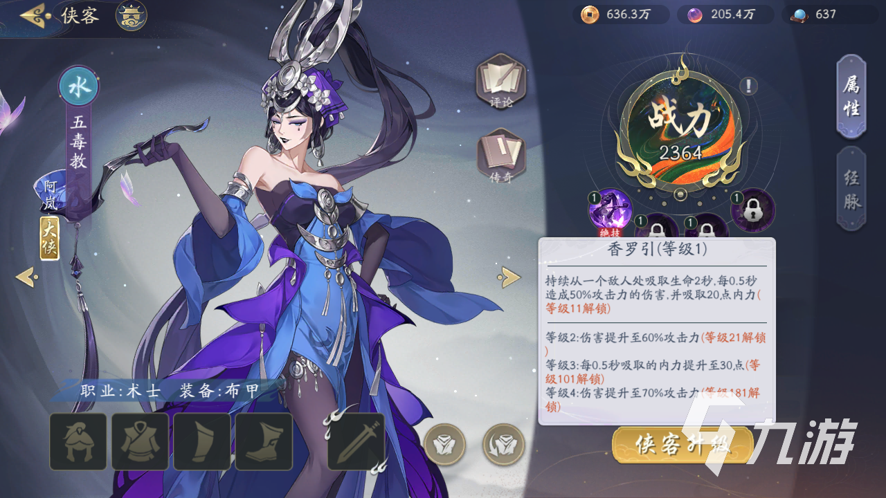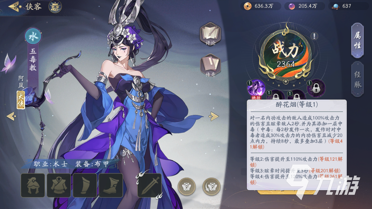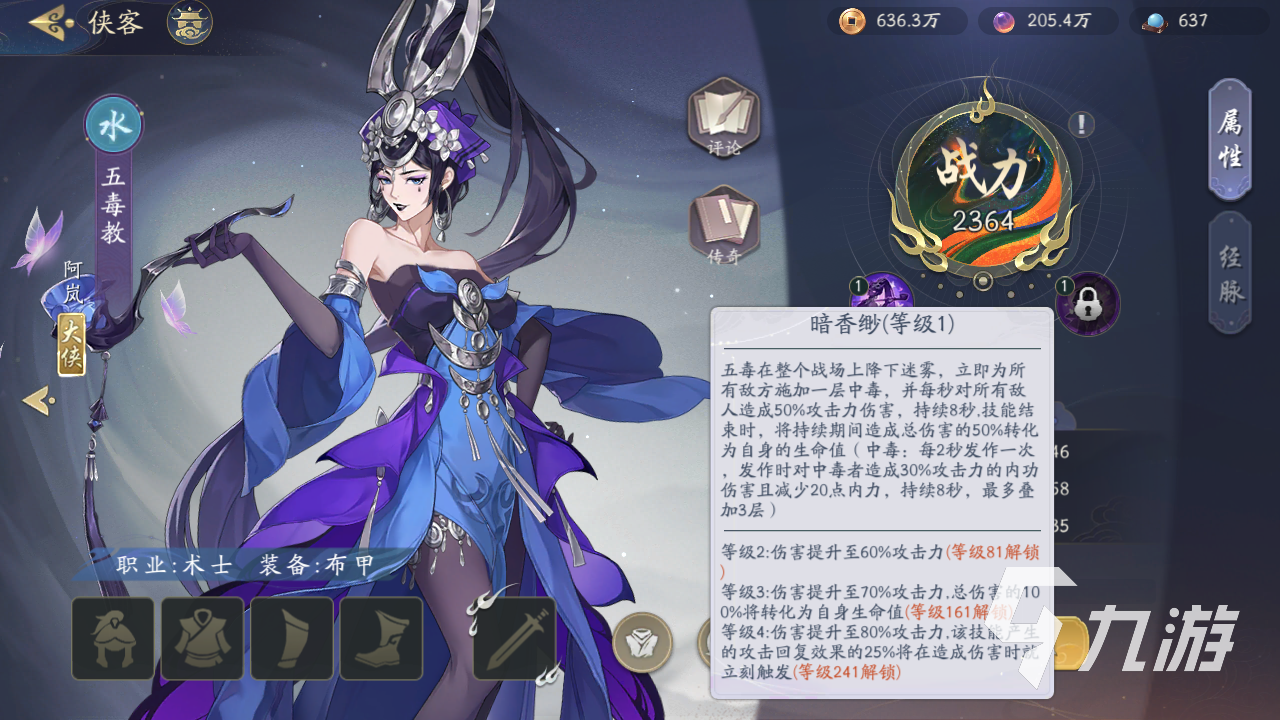 阿嵐這個俠客在品級上是紫色大俠品級的,基礎的設定還是不錯的,成長的上限也是很高的。在屬性上是水屬性的五毒教,這個門派的話一般都是使用毒氣來攻擊的。在職業(yè)上是術士,也就是靠技能來進行輸出的。繼續(xù)看技能。