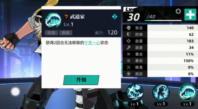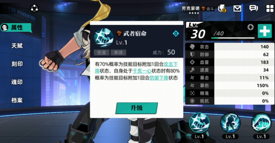 想要了解一個角色首要的便是先了解他的技能是怎樣的,這里的勞克蒙德首個能力是有百分之七十的幾率讓敵人的攻擊力下降,當自己處于強化狀態(tài)的時候,就會有百分百的幾率讓指定目標的防御里降低,這個狀態(tài)會持續(xù)一個回合。
