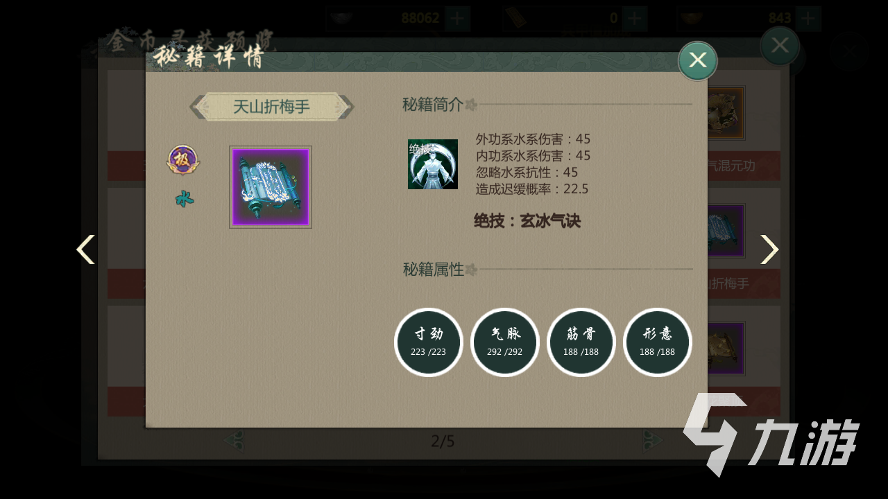 第三本推薦的是天山折梅手,這本秘籍是水屬性的,可以帶來(lái)水屬性內(nèi)外攻擊力的提升,基礎(chǔ)的就是45點(diǎn)加成,還是很不錯(cuò)的。除了攻擊之外,還可以忽略水屬性的抗性,對(duì)于峨眉這些熱門職業(yè)有不錯(cuò)克制。最后就是遲緩概率,攻擊會(huì)降低敵人移動(dòng)速度的。