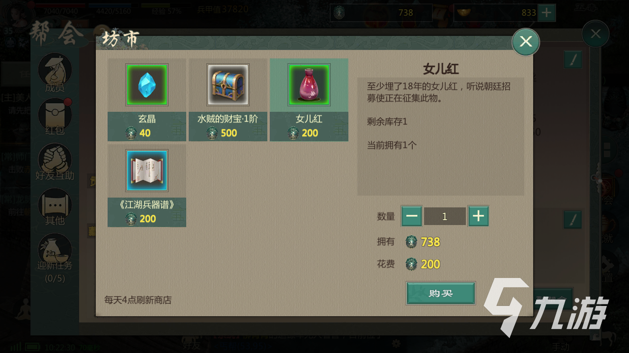 來(lái)源: 極光 作者: 鐵蛋 2021年10月22日 14:43幫會(huì)是游戲的一個(gè)核心玩法,可以帶來(lái)諸多的提升以及福利道具的獲取。有玩家想要知道劍網(wǎng)1歸來(lái)幫會(huì)坊市哪些值得買(mǎi),這個(gè)坊市內(nèi)道具還是有一些的,下面就帶來(lái)劍網(wǎng)1歸來(lái)幫會(huì)坊市道具推薦。