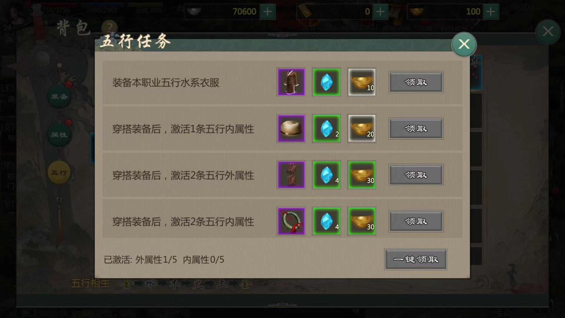 在五行中包括五行任務(wù),通過裝備本職業(yè)五行水系衣服可以獲得多種不同道具,穿搭裝備后激活一條五行內(nèi)屬性可以獲得相應(yīng)的獎勵,當(dāng)成功穿搭裝備后,可以激活兩條五行外屬性和兩條五行內(nèi)屬性即可分別獲得多種裝備道具,玩家可以通過五行激活方式獲得內(nèi)功,閃避,體質(zhì),會心,力量等多種不同的屬性獎勵。