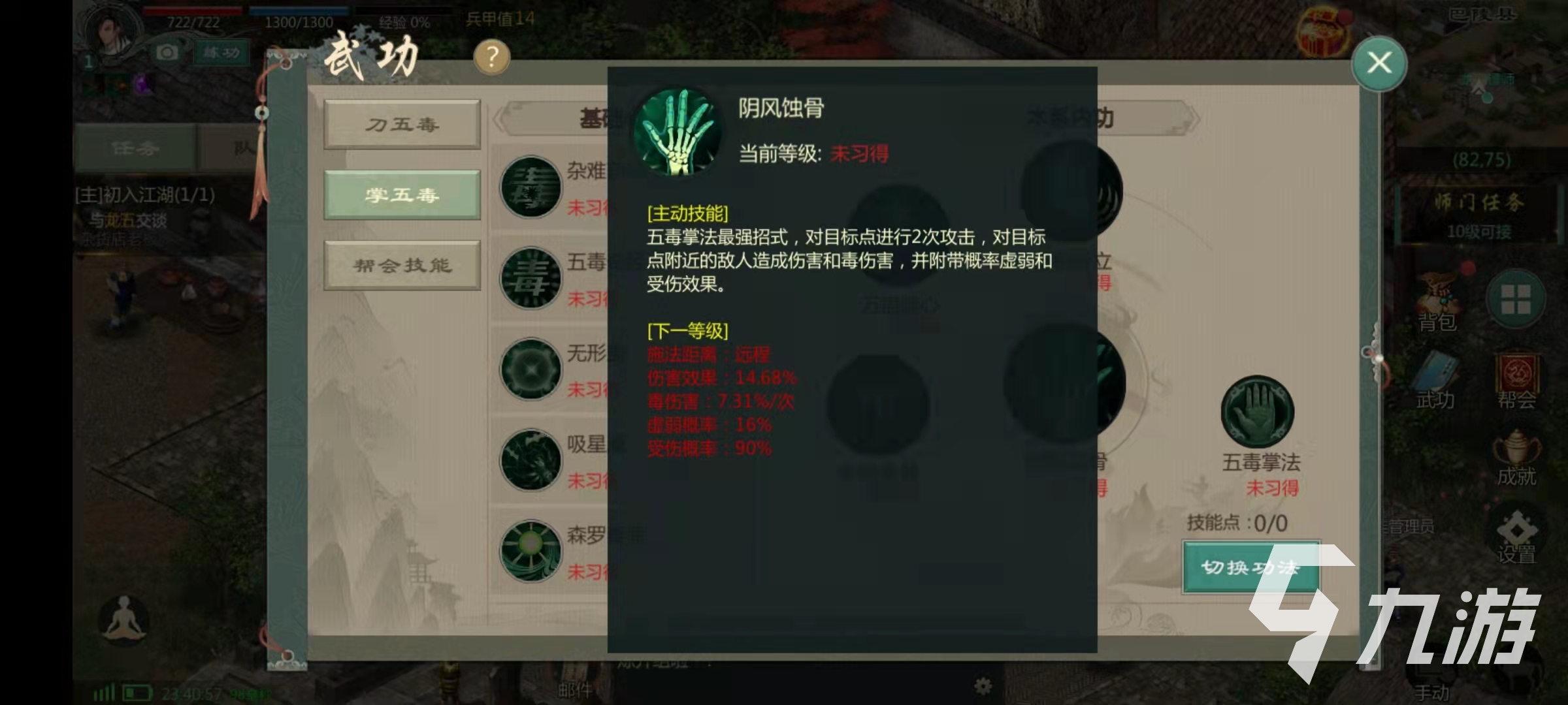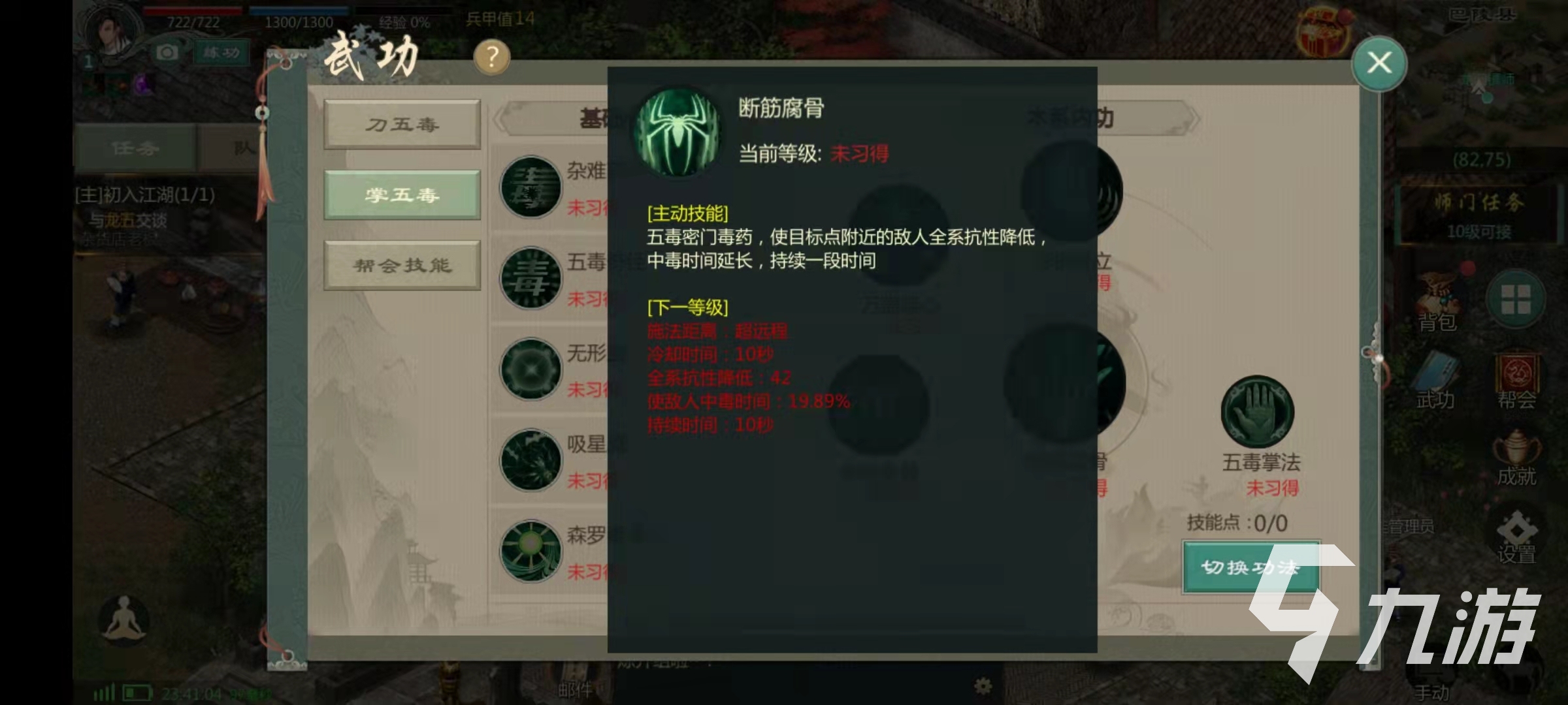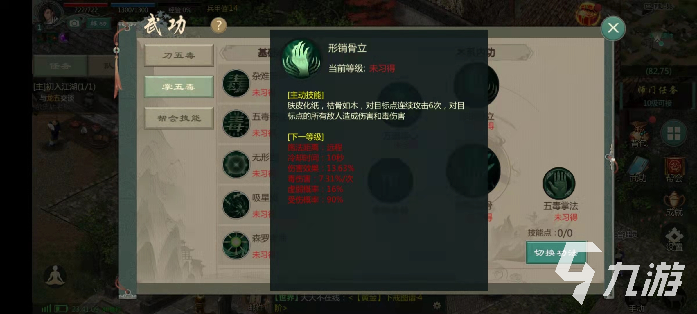 再說一下兩個分支,先說一下大部分玩家玩的掌五毒,掌五毒的技能主要是陰風蝕骨,形銷骨立,萬蠱弒心和斷筋腐骨。其中陰風蝕骨這個技能是基礎技能,效果是可以將對目標進行兩次攻擊,可以造成范圍性的傷害附加中毒效果,并且還有幾率造成虛弱和受傷。技能形銷骨立的效果是對目標位置的敵人造成傷害和中毒效果。技能萬蠱弒心是可以對自身周圍的敵人造成中毒效果。