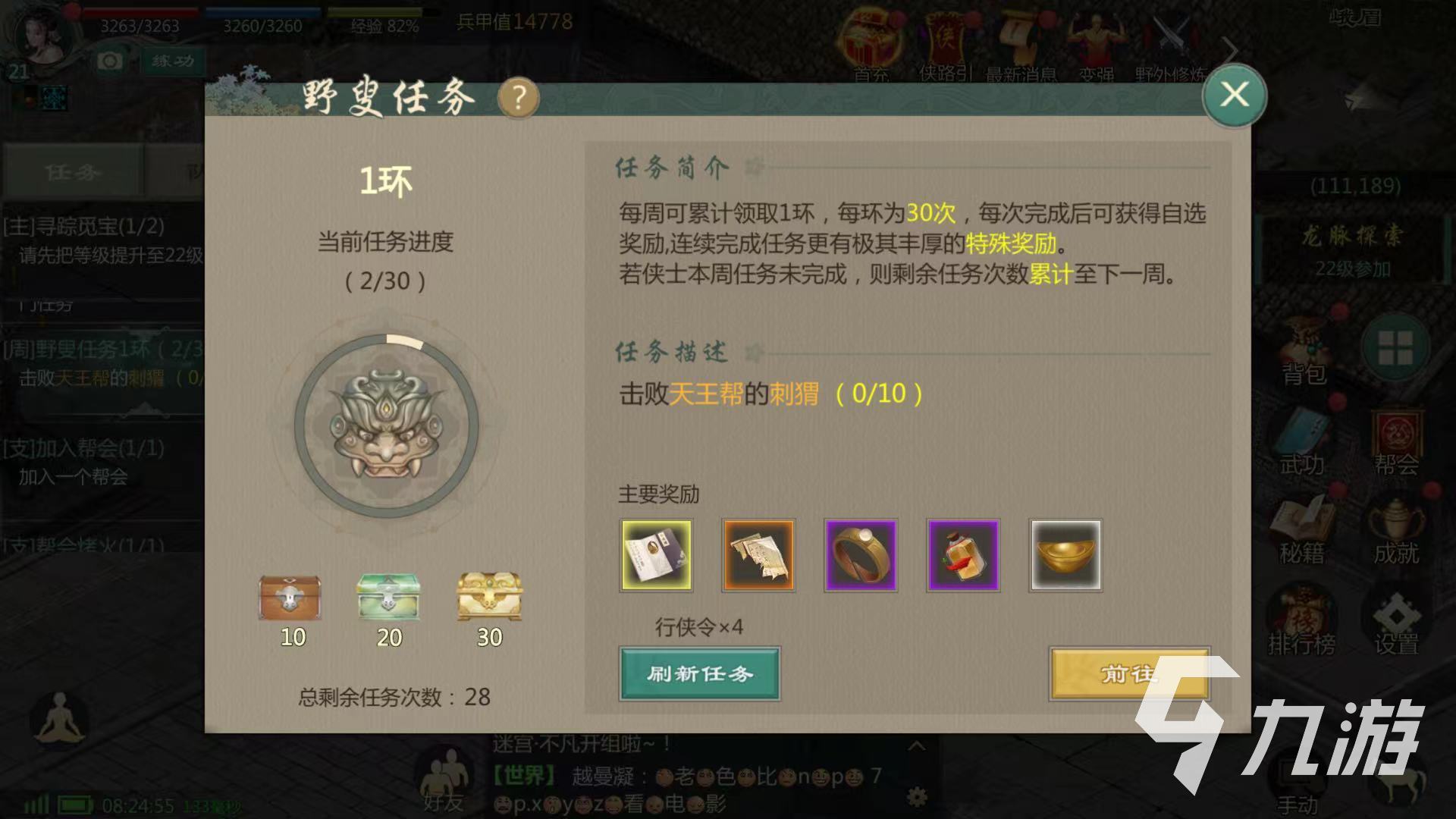 在野叟任務(wù)中,包括多種不同的任務(wù),玩家通過任務(wù)挑戰(zhàn)可以獲得自選獎(jiǎng)勵(lì),通過自選獎(jiǎng)勵(lì)中選擇任意一種獎(jiǎng)勵(lì)。所獲得的道具可以用于多種不同的場(chǎng)景,在野叟任務(wù)中,還可以對(duì)于當(dāng)前的任務(wù)不滿意進(jìn)行刷新任務(wù),刷新任務(wù)時(shí),需要使用到行俠令道具,每刷新一次則消耗一個(gè)行俠令。比如出現(xiàn)當(dāng)上交一個(gè)裝備時(shí),玩家并未準(zhǔn)備成功或無法提供,則可以通過刷新任務(wù)跳轉(zhuǎn)到下一任務(wù)執(zhí)行任務(wù)。當(dāng)行俠令道具消耗后,則無法進(jìn)行刷新野叟任務(wù)。