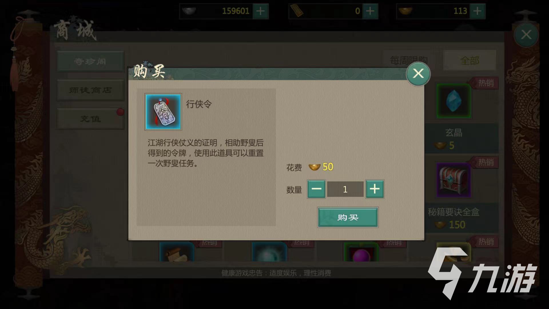 玩家進(jìn)入游戲后,可以在主頁面中看到背包。進(jìn)入背包后,可以查詢到目前所擁有的所有道具,其中包括行俠令道具。行俠令是江湖行俠仗義的證明,可以相助野叟后得到的令牌,使用此道具可以重置一次野叟任務(wù),此道具可以通過野叟任務(wù),奇珍閣進(jìn)行獲得。