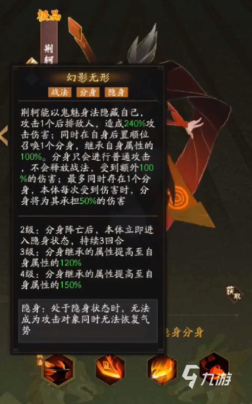 第二個推薦的是荊軻,荊軻這個伙伴品級也是極品的,基礎能力不錯。荊軻的定位也是輸出,同時帶有分身的能力。戰(zhàn)法技能在攻擊敵人之后會在身后召喚一個分身,分身會繼承本體百分百的屬性。但是分身只會進行普攻,不會使用戰(zhàn)法技能。在本體受到傷害的時候,分身會承擔50%的傷害。