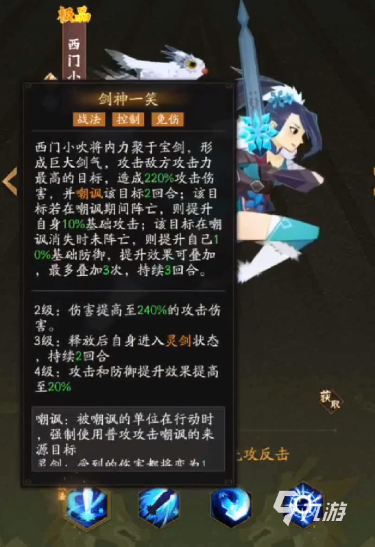 西門小吹這個伙伴在品級上是屬于極品的一個設定,極品的話基礎能力是非常不錯的。在定位上西門小吹是一個控制、嘲諷和免傷的設定,這就代表這個伙伴能力是偏向于防御和反擊類型的。